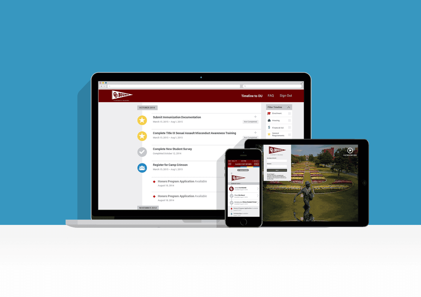 The University of Oklahoma is a top-tier public university serving approximately 17,000 undergraduate and 3,000 graduate students. Dom & Tom’s mission was to create an innovative and simplified experience for incoming OU freshmen to easily manage all upcoming events, deadlines, and tasks from admission to the first day of class via a custom iOS and Android applications. Client