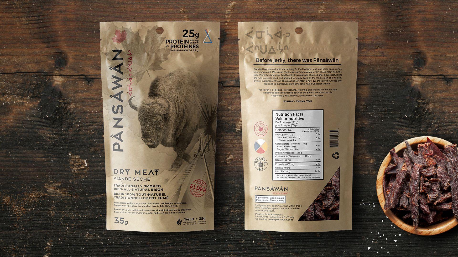 Aqomi created the brand and packaging concept for Pânsâwân Drymeat, one of the first businesses to commercially sell the First Foods of Canada.