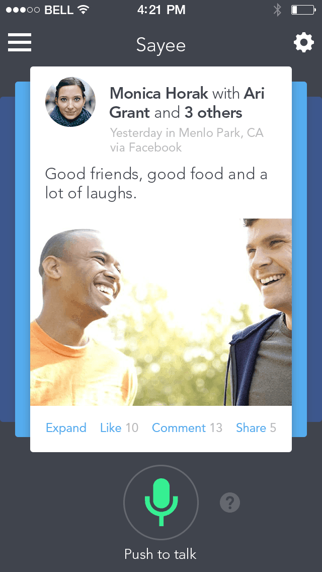 Sayee is a voice controlled platform for interacting with your social media feeds.