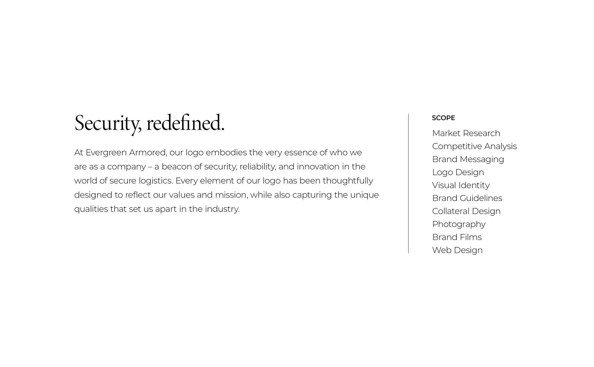 Evergreen Armored’s new brand marks an exciting chapter in the company’s journey, blending timeless tradition with forward-thinking innovation. With a fresh logo design, they’re signaling the commitment to staying at the forefront of the secure logistics industry while honoring their roots.Client