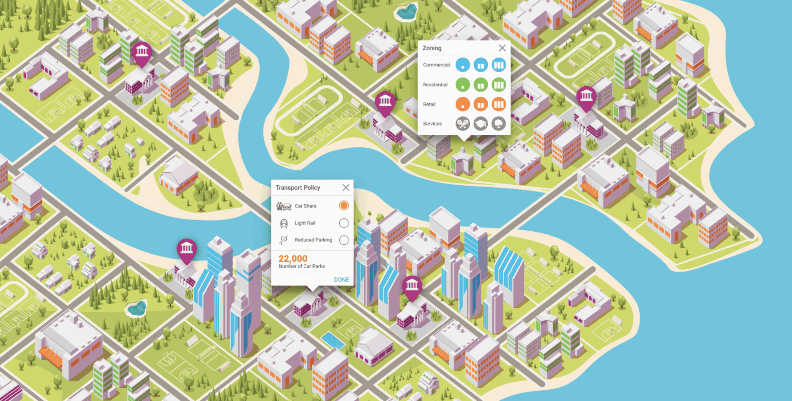 A virtual sim-city visualises proprietary data to portray the challenges of sustainable building.