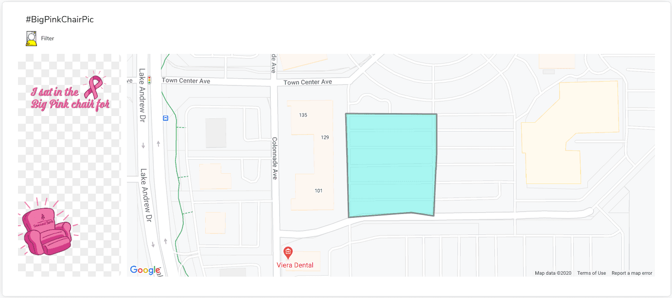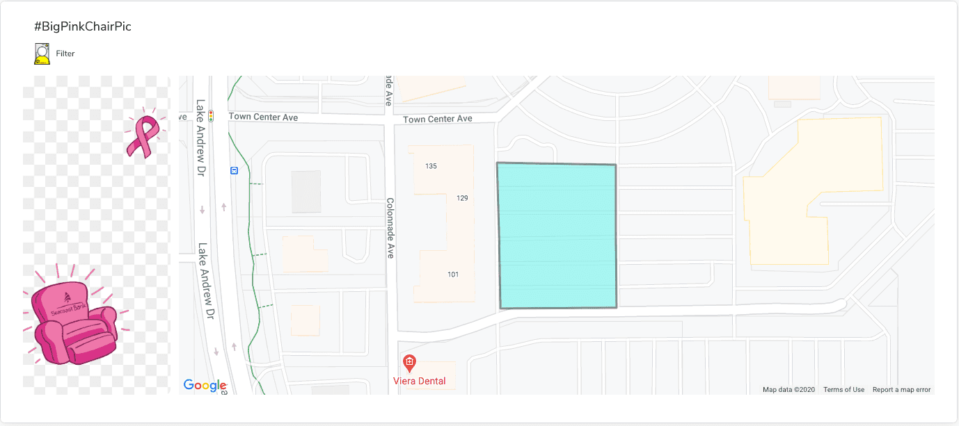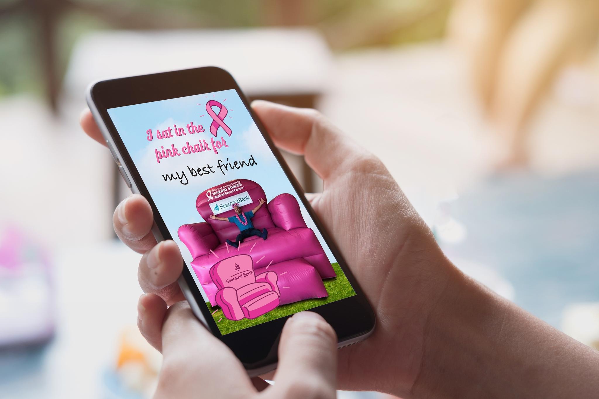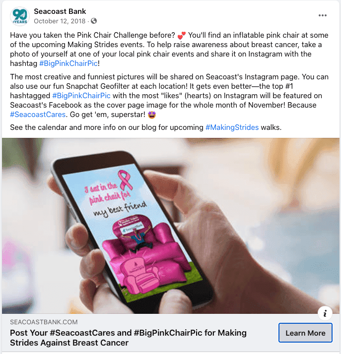 The purpose of the UGC (user generated content) and social media engagement campaign was to have people follow the itinerary of the iconic larger than life inflatable, The BIG Pink Chair, and snap their best pictures on the chair while using hashtags such as #BigPinkChairPic and #SeacoastCares. The top picture would become Seacoast Bank's Facebook Cover Image for the entire month of November, further extending awareness beyond October.