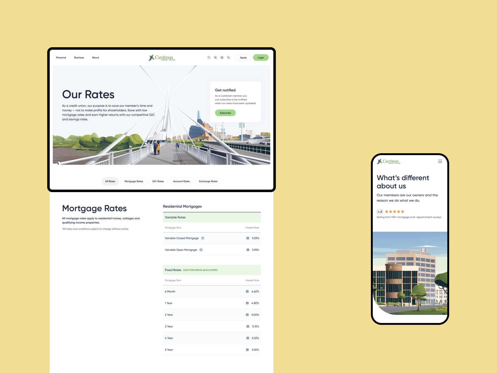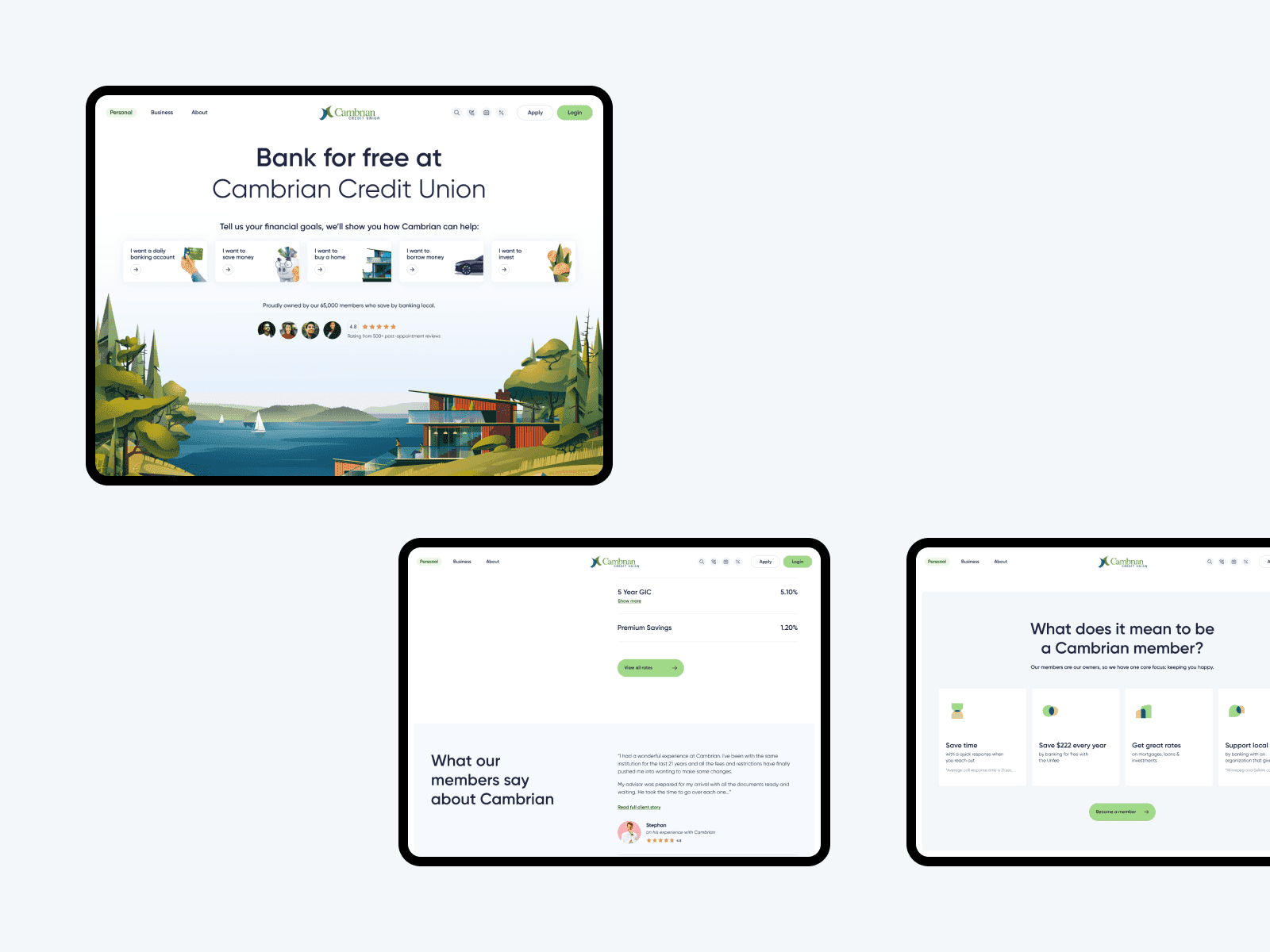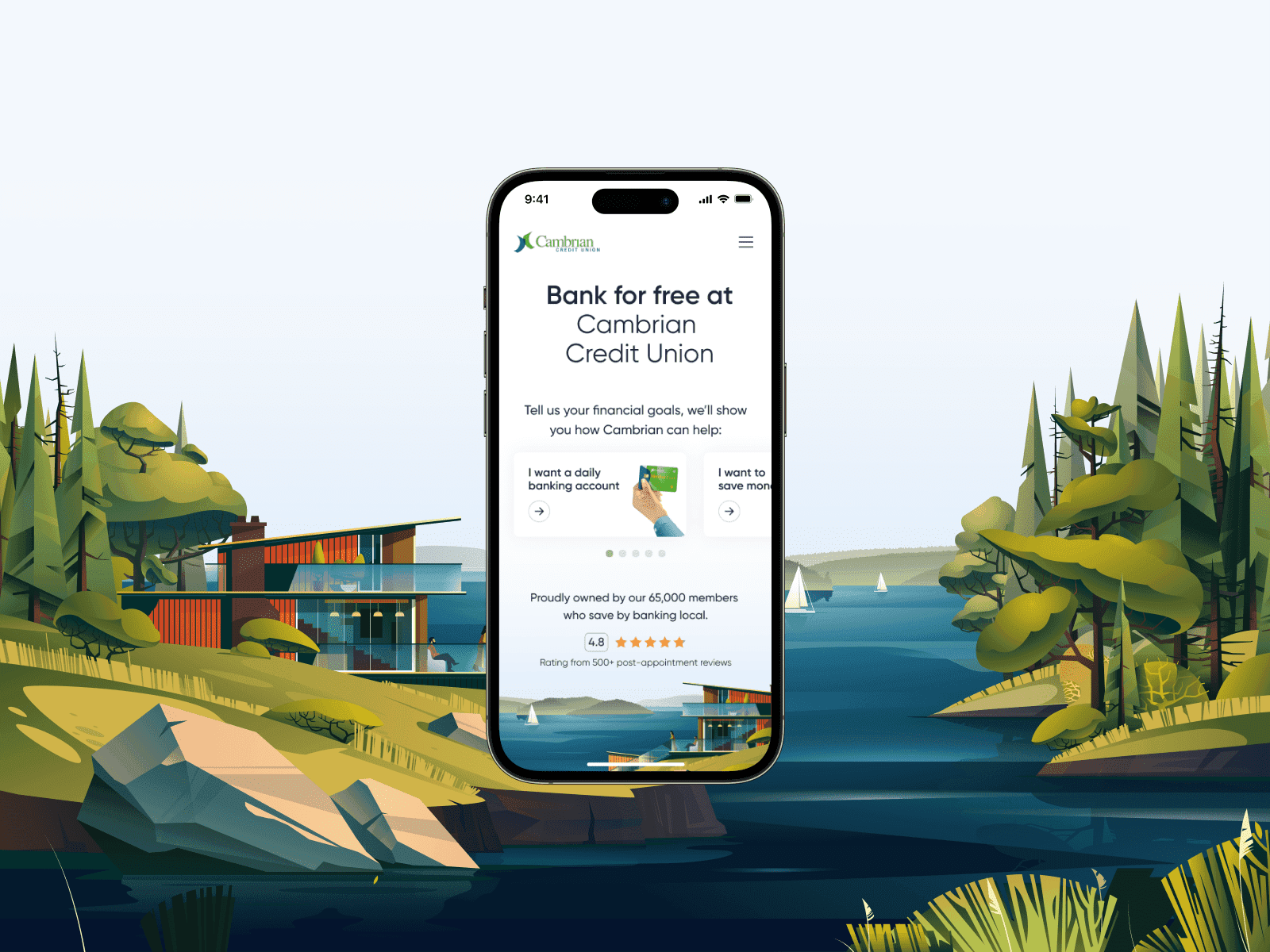 Our latest project with Cambrian Credit Union aimed to simplify the traditionally stressful and intimidating experience of banking. We captured Cambrian's community values to welcome users to a refreshing, welcoming digital-first way to bankClient