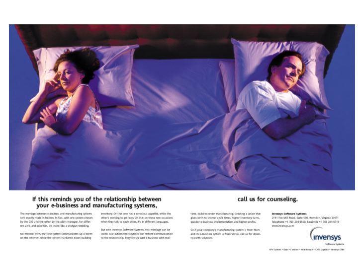 Invensys Software Systems developed a great product that no one in its target audience could understand – software that would allow manufacturers' legacy software systems to talk to each other and work together. The division lacked focus, was floundering and losing money. We created a campaign that clearly spelled out for the first time what these products did and how they benefitted manufacturing companies. Both verbally and visually the ads did this in very understandable, human terms. They attracted top readership scores in B2B magazines, whose advertising departments were so impressed they upgraded them to premium space at no added cost. And the campaign was a major factor in enabling the division to earn its first profitable year ever.Client