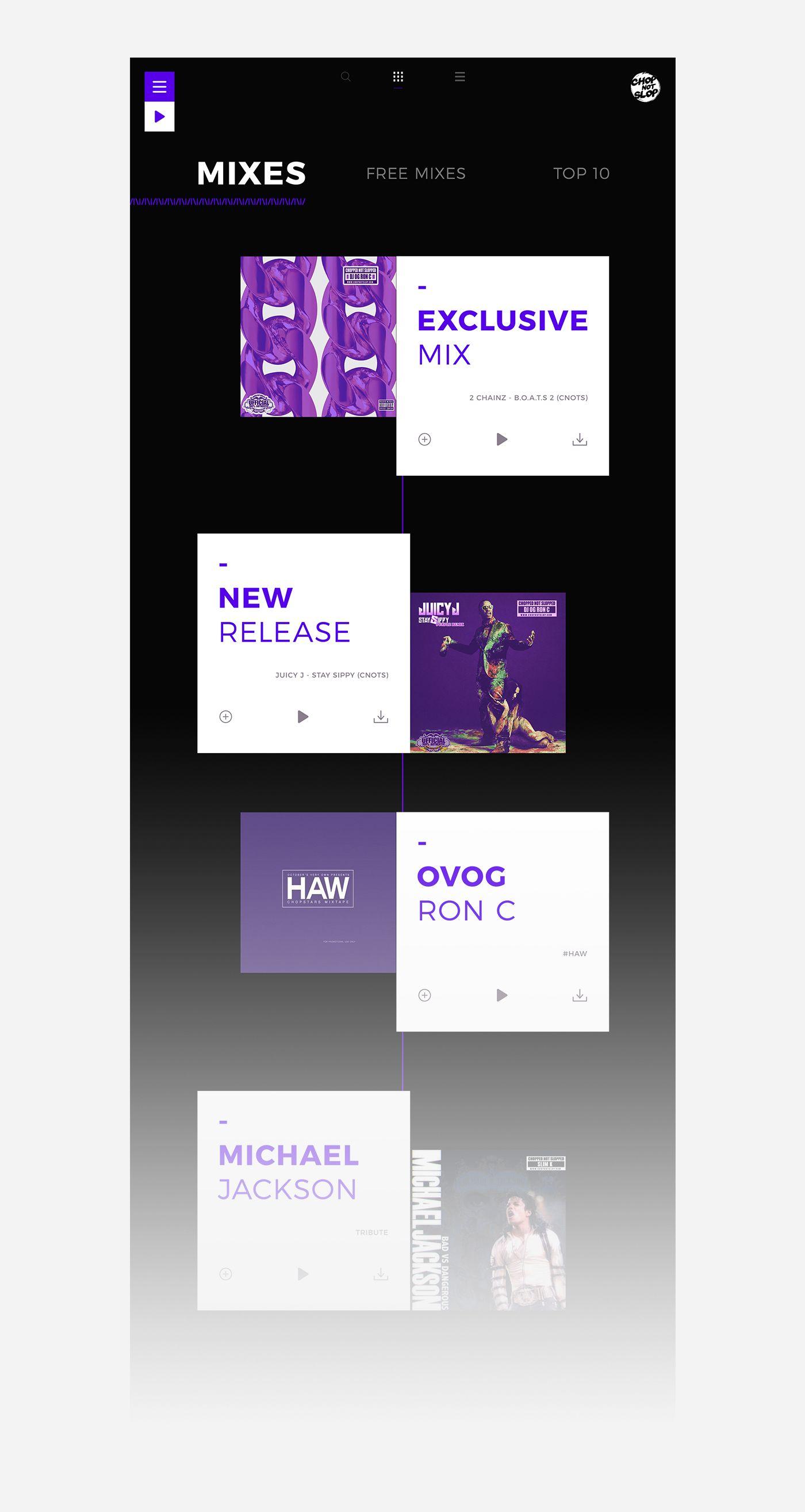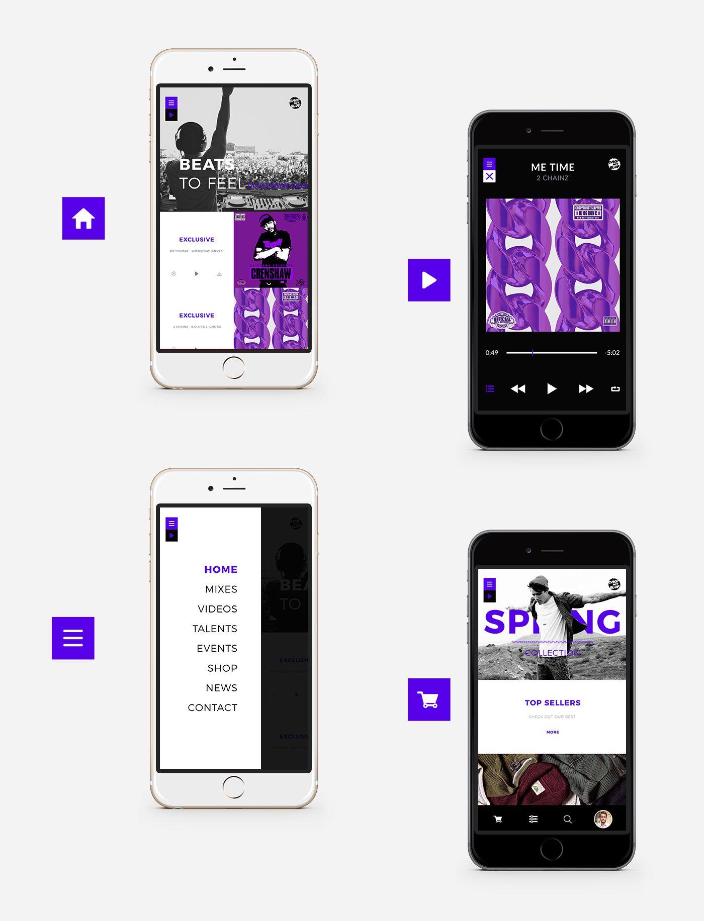 Created by OG Ron C, the co-founder of Swishahouse Records, ChopNotSlop refers to a subgenre of American turntablism that emerged from another subgenre of hip-hop called Chopped and Screwed, except it’s characterized by a pitch that’s been lowered about three times. Our challenge was to redesign their website while establishing a new brand identity, and we began by designing a new logo and choosing a new color palette.