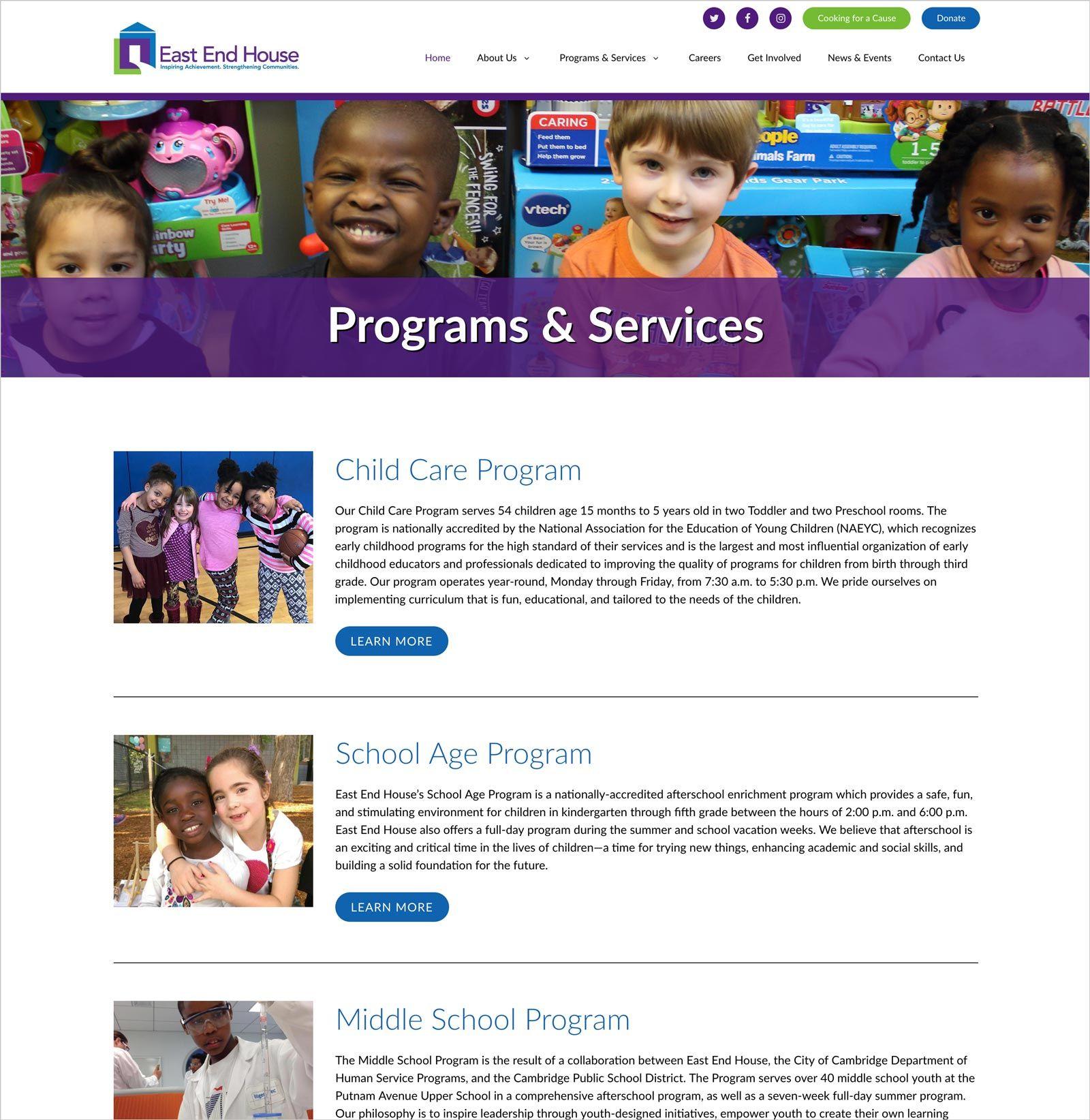 East End House was ready for a fresh look for their website, and with the need to bring it up to speed with today’s best practices in the industry – we developed the site in WordPress. Since WordPress is a very user-friendly platform, this enables EEH to streamline their website updating process and gives them the ability to maintain an active web presence and keep vital information for the community always current.Client