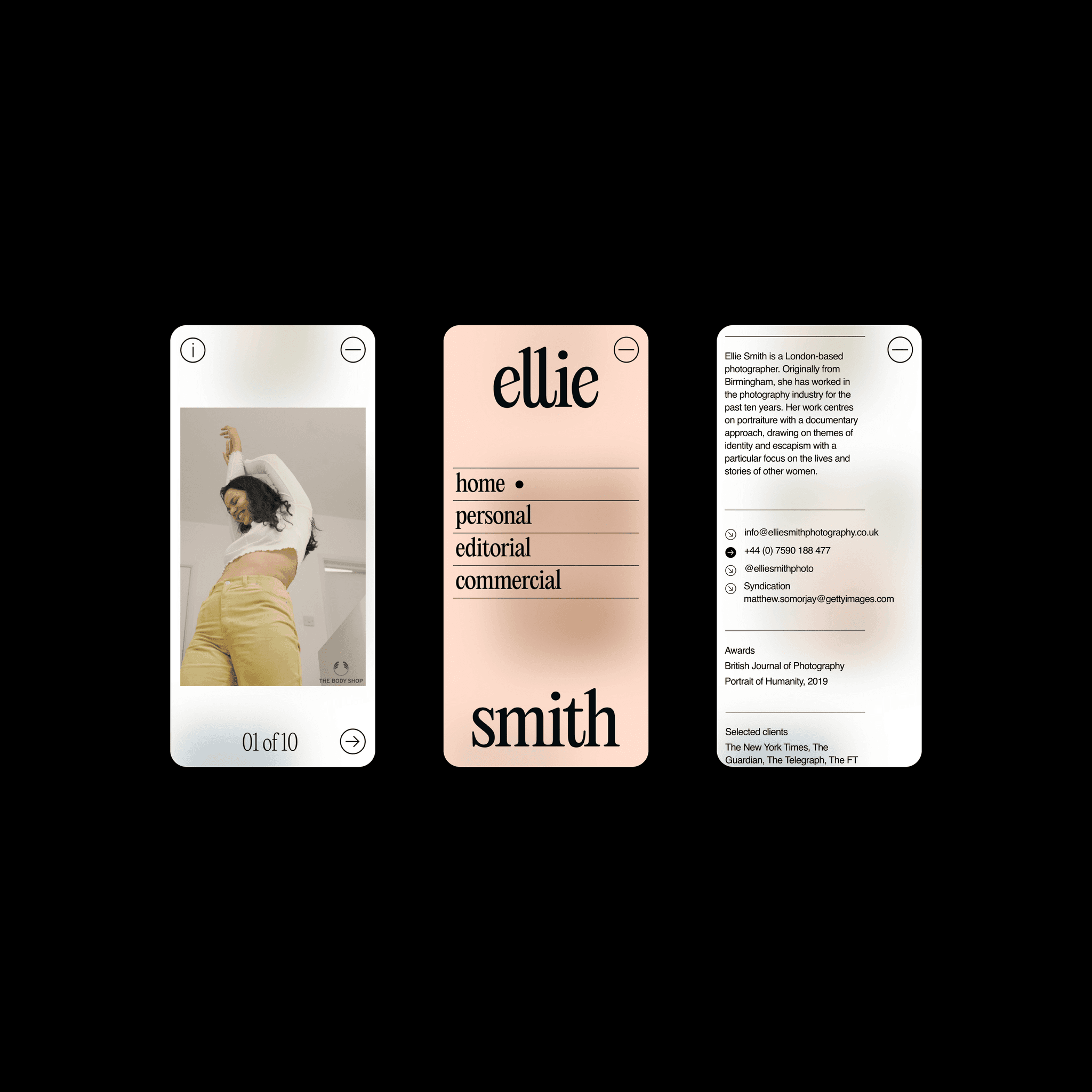 Ellie Smith, a London-based photographer, creates intimate portraits that explore identity and escapism through women's stories. Her documentary-style editorial approach demanded a brand that matched the sophistication of her work.Client