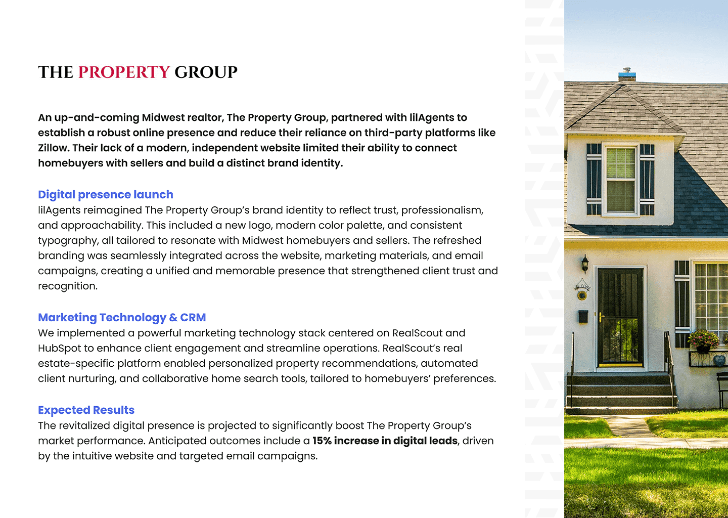 An up-and-coming Midwest realtor, The Property Group, partnered with lilAgents to establish a robust online presence and reduce their reliance on third-party platforms like Zillow. Their lack of a modern, independent website limited their ability to connect homebuyers with sellers and build a distinct brand identity.Client