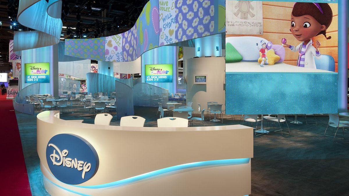 The solution came in the form of multidimensional, media centric, and accessible entertainment. By using an abstract design, rigging enormous fabric surfaces, and projecting colorful video, Disney’s booth transformed in to a show stopping production. The color drew the eye of the standard passer-by, the shape of the exhibit captivated the audience, and the undeniable branding allowed a no fuss, straightforward marketing opportunity, capable of showing the wide range of Disney’s portfolio, with out seeming busy or strained.