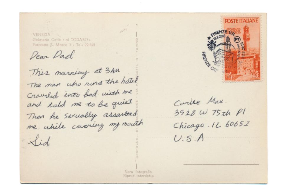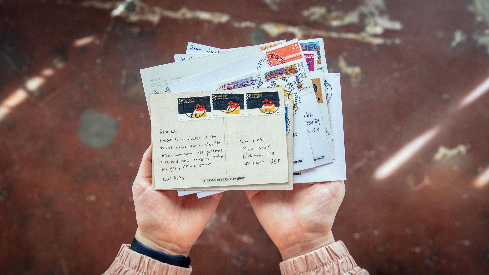 We sourced postcards and postage stamps from cities around the globe and hand-wrote messages detailing rape, harassment, and other grueling experiences that women had shared with us. Daughters writing to fathers, friends writing to friends, girlfriends writing to boyfriends or sisters about what befell them in cars, in hotels, and on the streets of everywhere from Istanbul, Hamburg, Los Angeles, São Paulo, Tokyo, Addis Ababa to Sochi. Over 200 personal cards in unique handwriting were installed at the conference to be held, read, and experienced.
