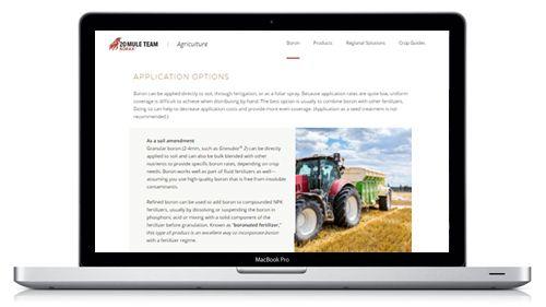 Rio Tinto Borates (U.S. Borax) Agriculture division produces nearly a third of the world’s refined borates—essential nutrients that affect crop yields worldwide. Rio Tinto’s aim with their new website was to provide growers, crop consultants, agronomists, and borate distributors and wholesalers from across the globe a one-stop resource to learn about boron deficiency and its effect on crop health and yield, specific to their location. The site was to also be a catalyst for differentiate the company as a purposed-driven brand and to prove value to end-stakeholders by providing easy to use calculators and extended product information to help them be more successful.Client